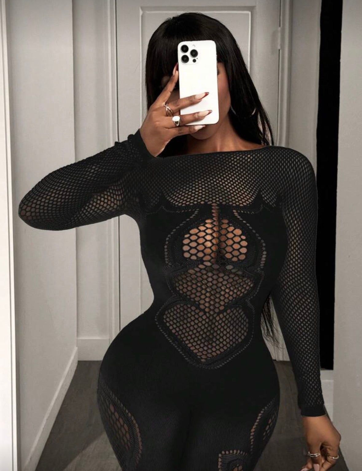 Turn heads in the Affection Bodysuit — a sultry, full-body statement piece designed to sculpt and highlight every curve. Crafted from stretchy fishnet fabric with bold cutout detailing, this long-sleeve jumpsuit effortlessly blends sexy and sleek. Perfect for nights out, performance looks, or layering under an oversized blazer for high-impact streetwear.