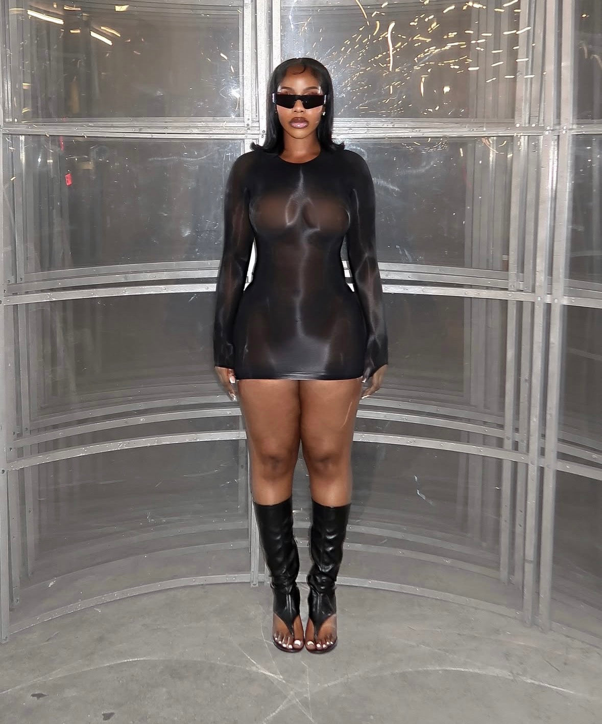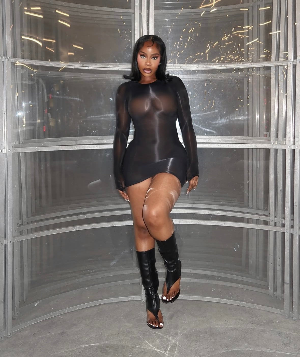 Turn heads the moment you step into the room. The Lyquid Dress is a sleek, high shine bodycon mini designed to hug your curves and create a bold, confident silhouette. With its ultra smooth liquid like finish and sheer long sleeves, this dress gives a futuristic, high fashion edge while still keeping the fit feminine and sexy.