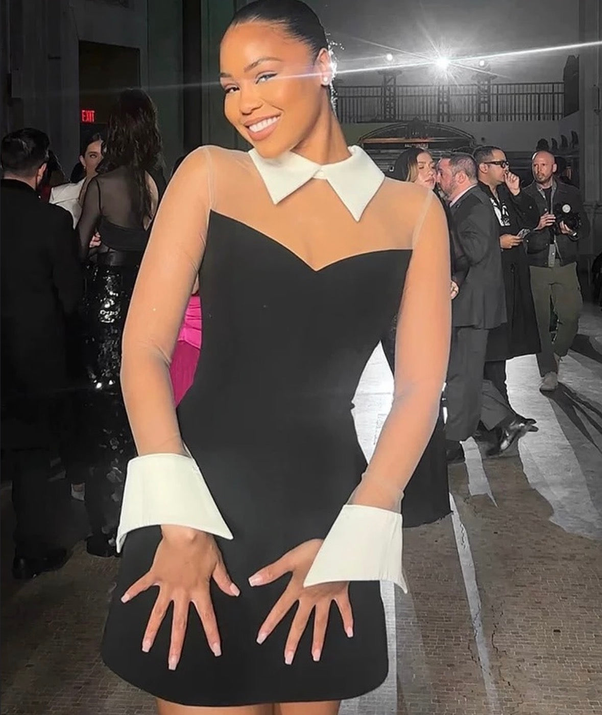 Step into timeless elegance with the Marie Dress, a chic black mini dress that blends sophistication with modern edge. Featuring a sweetheart neckline illusion, sheer mesh long sleeves, and bold contrasting white collar and cuffs, this piece is perfect for turning heads at any event. Whether it’s dinner, a cocktail party, or a night out, the Marie Dress delivers classic style with a fashionable twist.