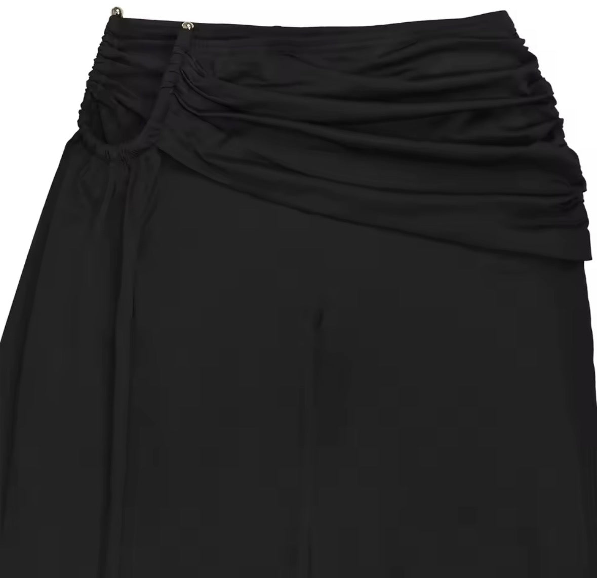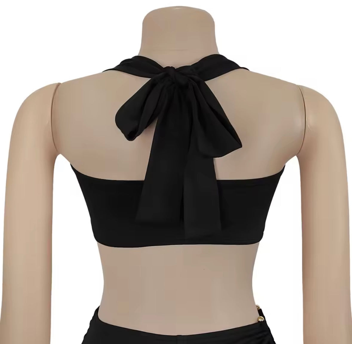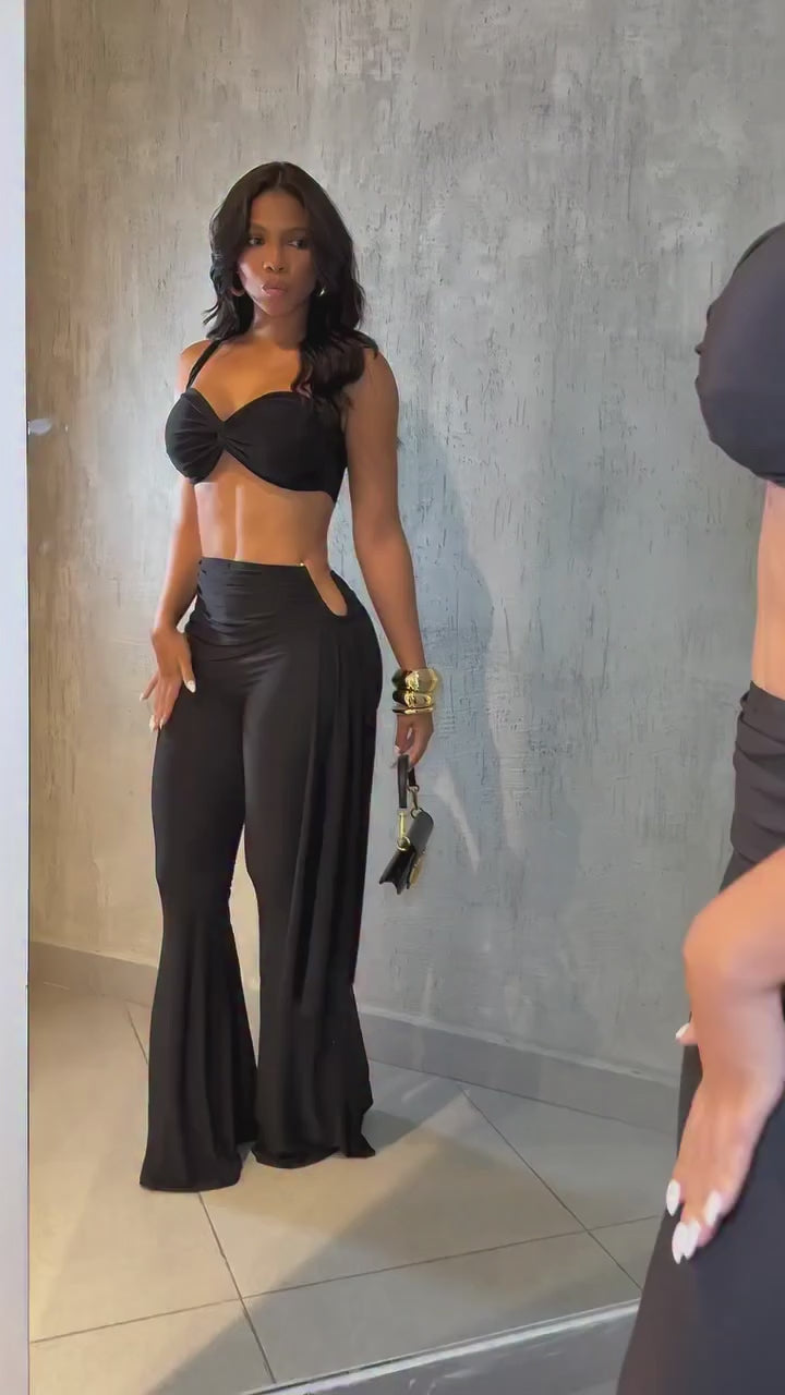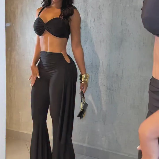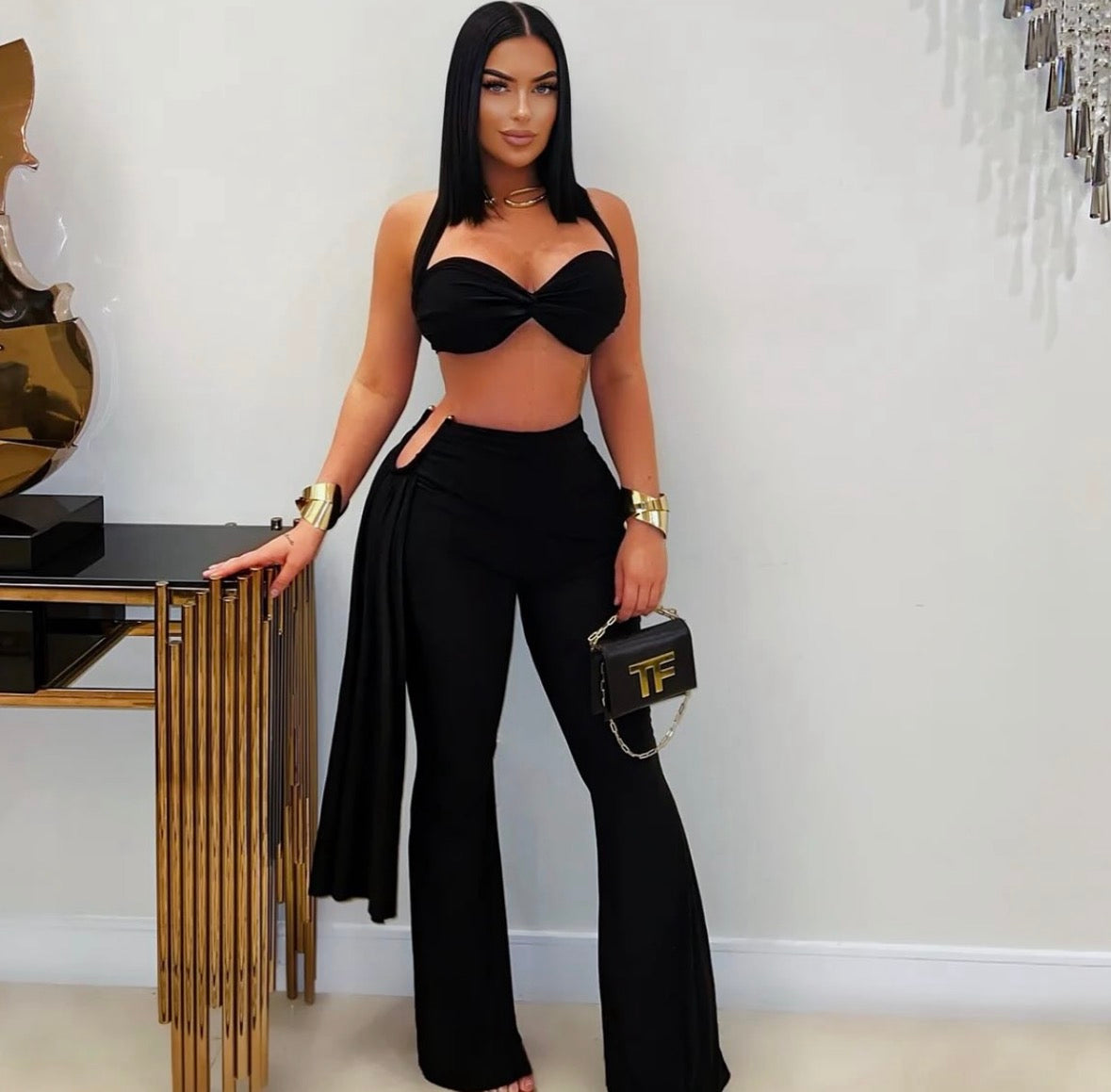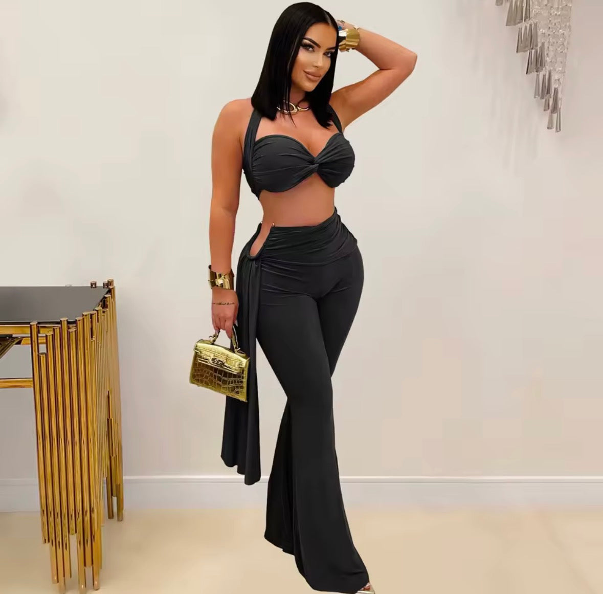Unleash your inner goddess with the Princess Jasmine Set. This bold two-piece features a twisted bandeau-style halter top with an open tie-back, paired with high-waist flared pants accented by a dramatic draped sash. Designed to flatter your curves while keeping it classy, this set is perfect for making a statement at upscale events, parties, or nights out.