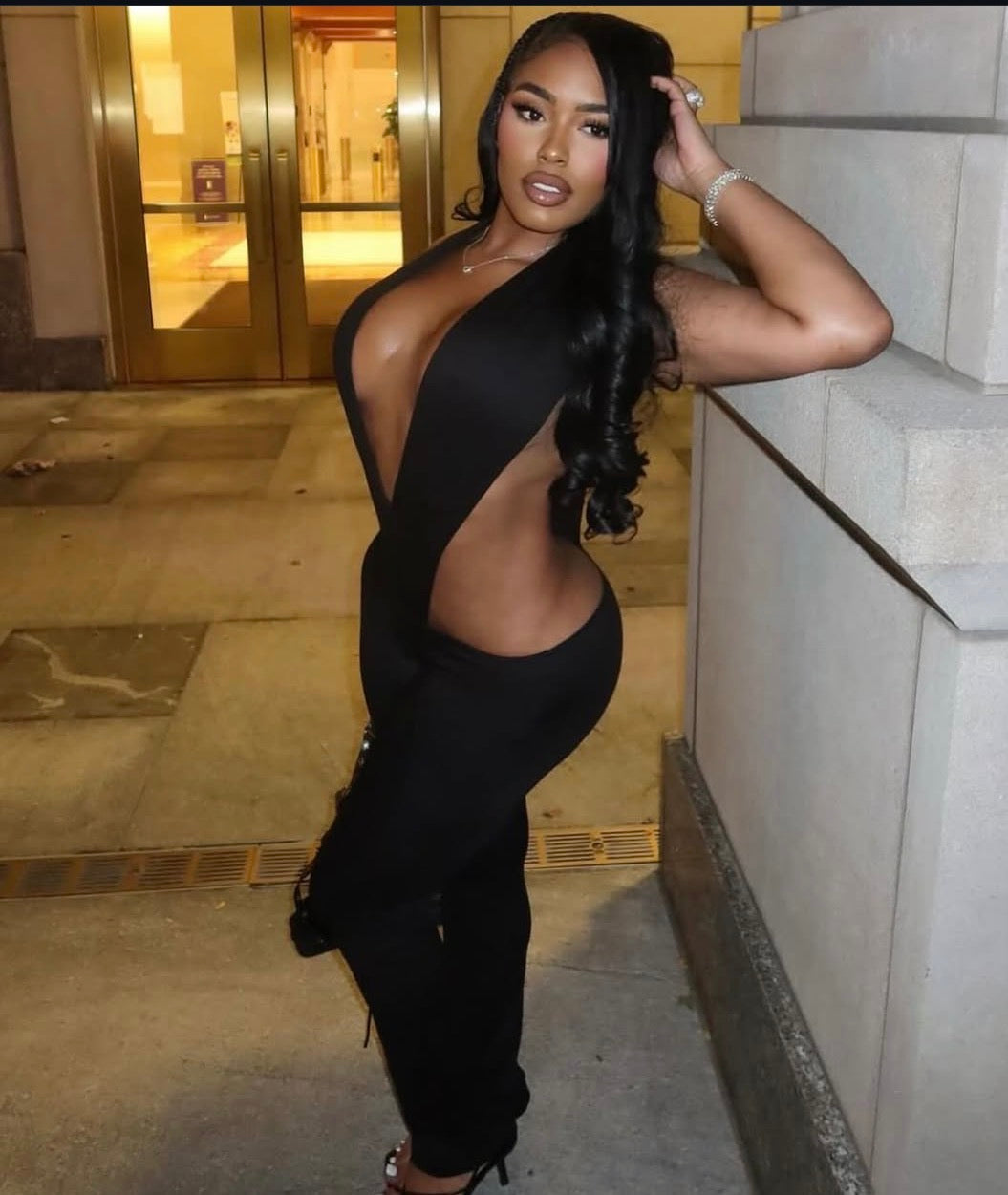 Step into luxury with the Vault Set — a showstopping, figure-hugging piece that defines bold femininity. Designed with a deep plunging neckline and open side cutouts, this jumpsuit is made for those who love to make an entrance. The sleek stretch fabric shapes your curves while offering a smooth, sculpted fit for any evening look. Pair it with strappy heels and your favorite statement bag for the ultimate night-out vibe.